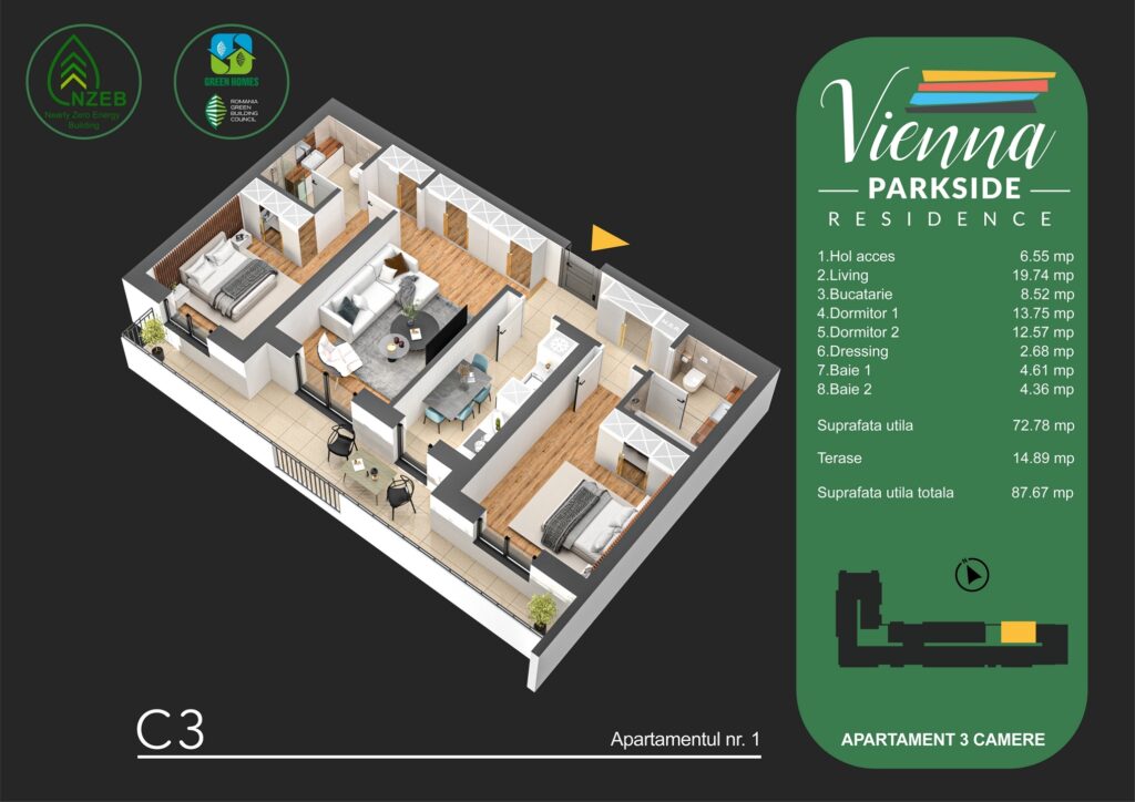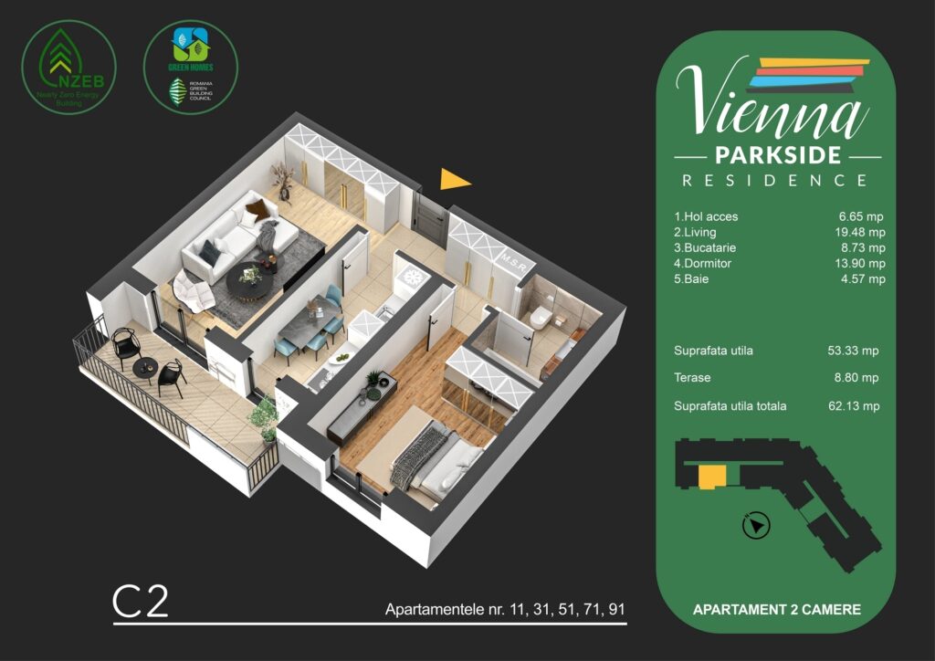 - Eficienta energetica – Apartamente certificate GREEN HOMES, cu costuri reduse de intretinere.