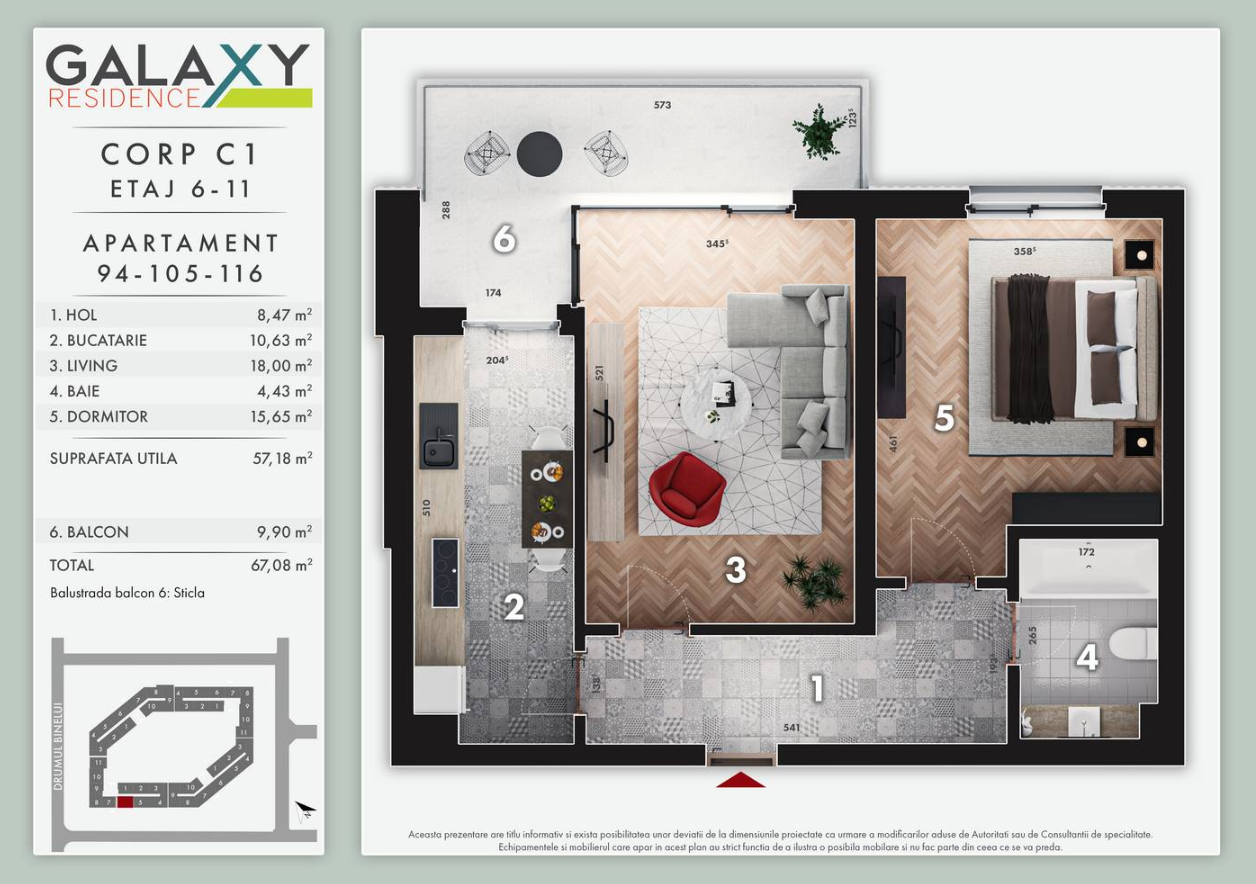 Locuinta este amplasata la etajul 10 din 11 si dispune de o suprafata utila de 57.18 mp, la care se adauga un balcon de 9.90 mp, rezultand o suprafata totala de 67.08 mp.