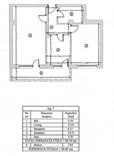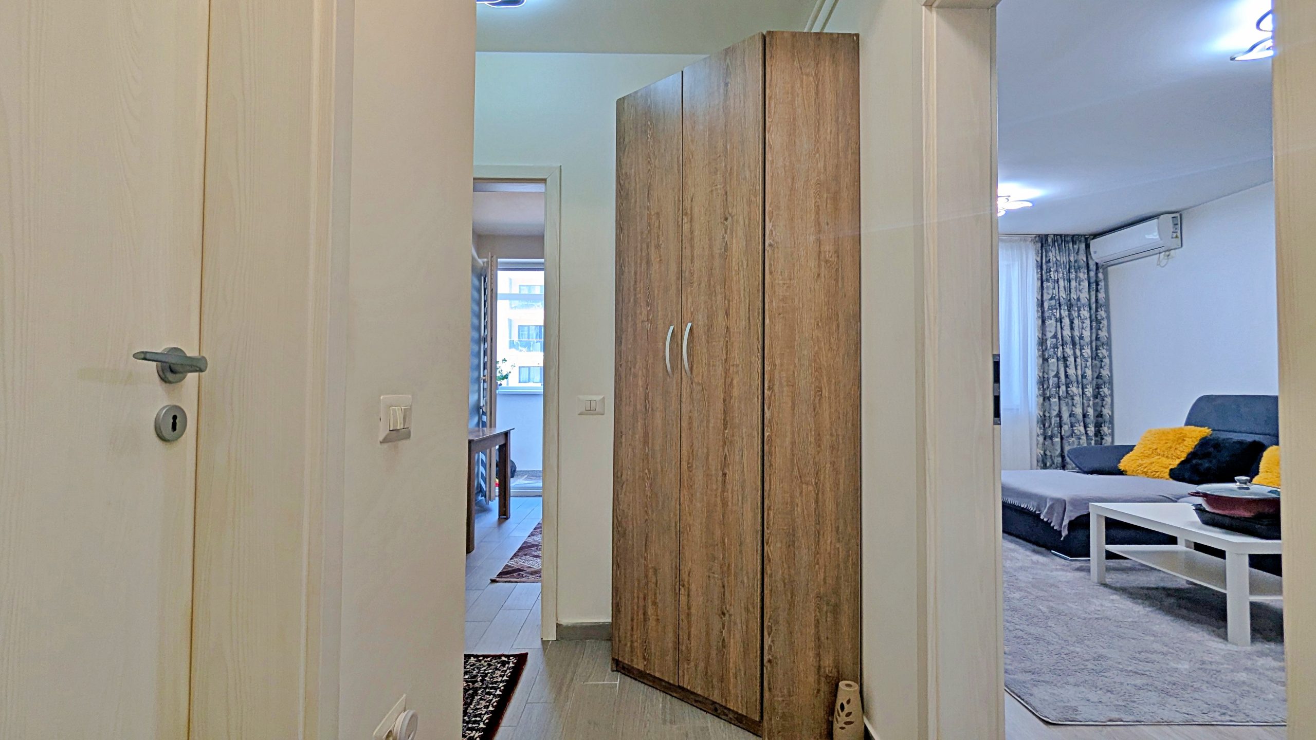 Cu o suprafata utila de 56.59 mp si un balcon inchis de 7.84 mp, rezultand o suprafata totala de 64.43 mp, apartamentul impresioneaza prin compartimentarea eficienta si separarea clara a zonelor de zi si de noapte.