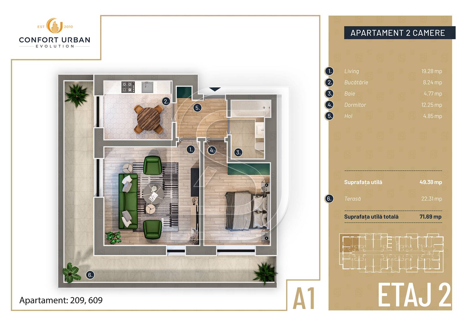 Living: 19.28 mp, bucatarie: 8.24 mp, baie: 4.77 mp, dormitor: 12.25 mp, hol: 4.85 mp, terasa: 22.31 mp