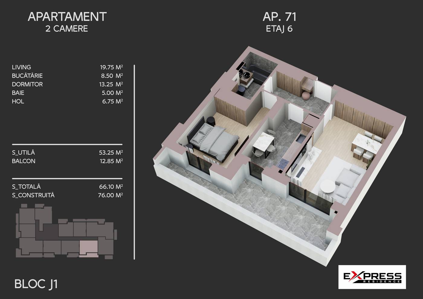 Locuinta are o suprafata utila de 53.25 mp, completata de un balcon generos de 12.85 mp, rezultand o suprafata totala de 66.10 mp – un spatiu bine echilibrat, potrivit atat pentru locuire, cat si pentru investitie.