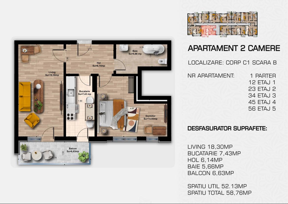 Locuinta dispune de o suprafata utila de 52.13 mp si un balcon de 6.63 mp, rezultand o suprafata totala de 58.76 mp.