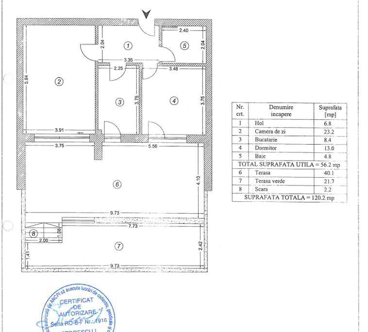 Locuinta are o suprafata utila de 56.2 mp, completata de o terasa de 40.1 mp si o terasa verde de 21.7 mp, rezultand o suprafata totala de 120.2 mp — un mix foarte echilibrat intre spatiul interior si cel exterior.