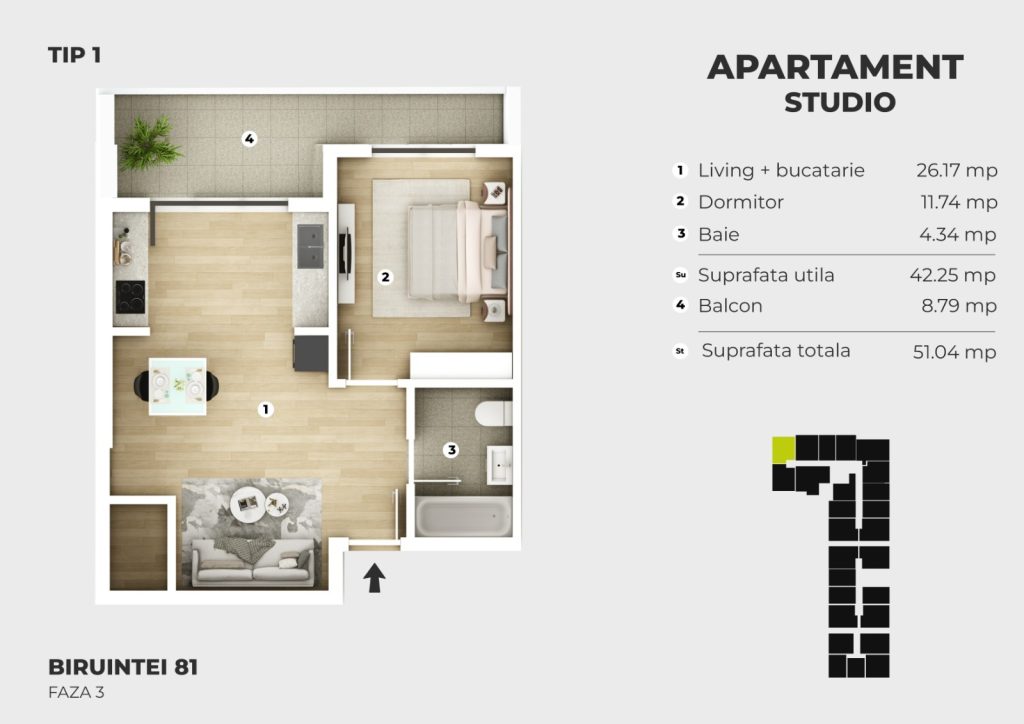 Locuinta are o suprafata utila de 42.25 mp, completata de un balcon generos de 8.79 mp, rezultand o suprafata totala de 51.04 mp – o configuratie peste medie pentru aceasta tipologie.