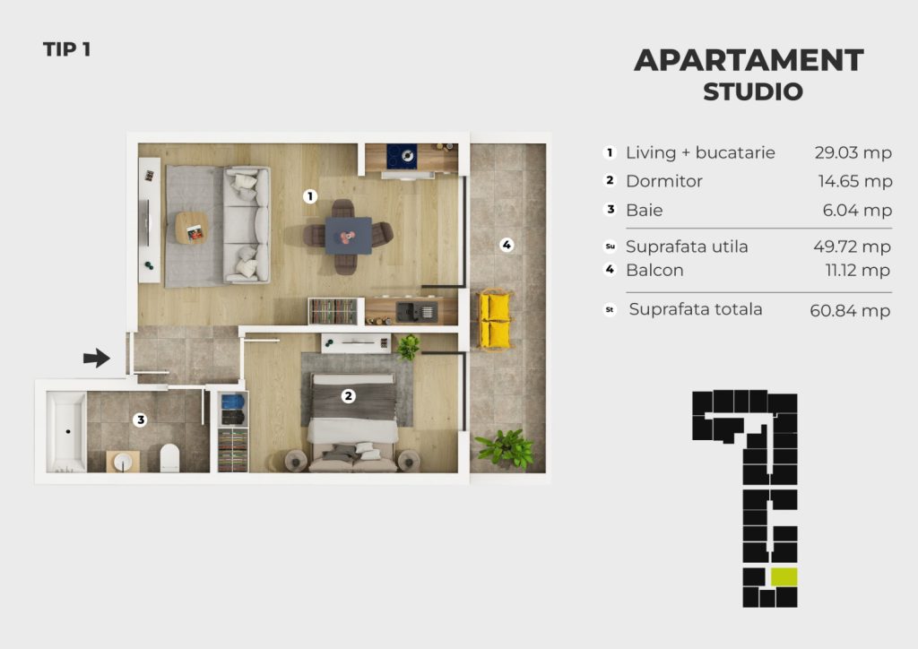 Locuinta are o suprafata utila de 49.72 mp, completata de un balcon generos de 11.12 mp, rezultand o suprafata totala de 60.84 mp.