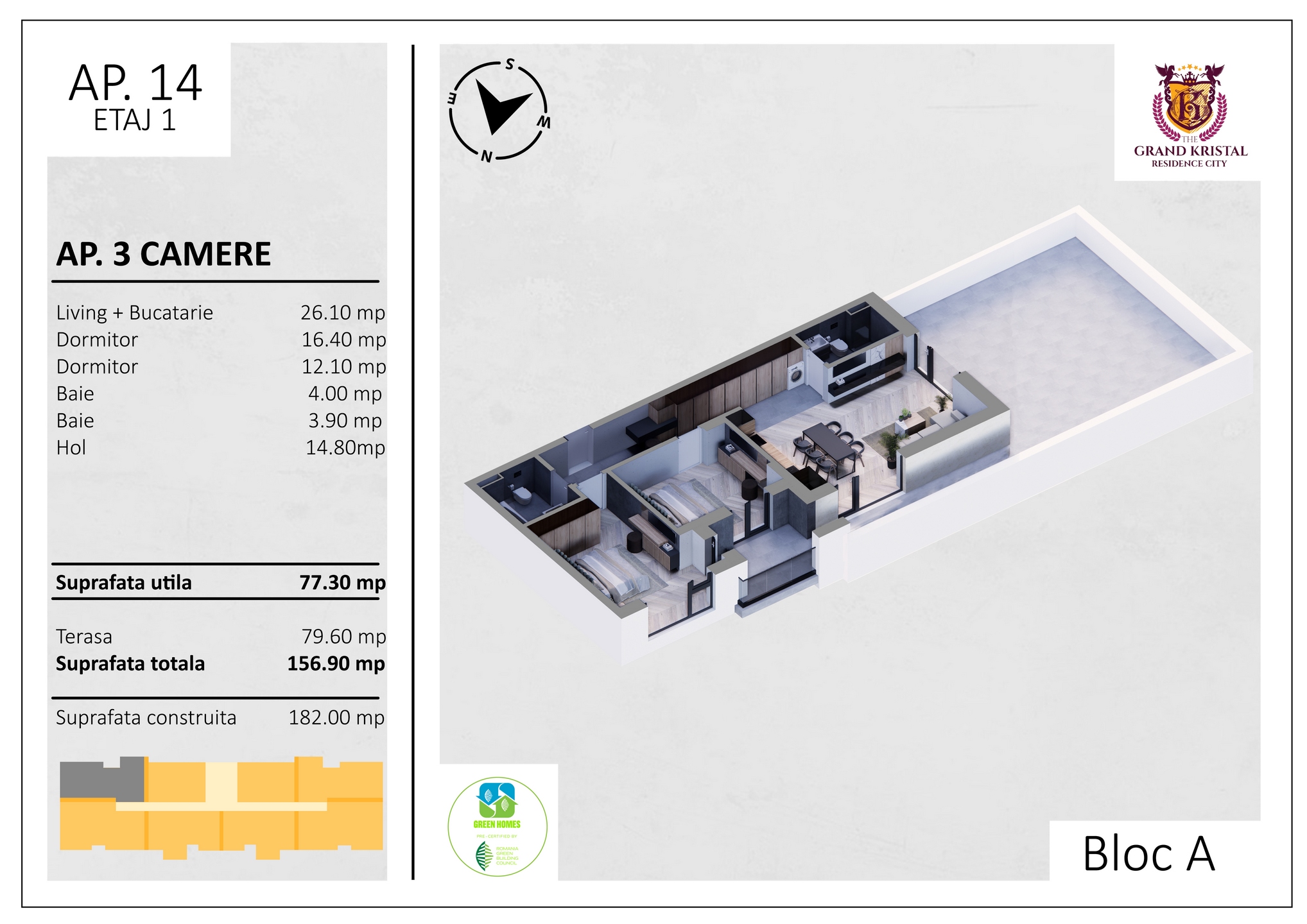 Locuinta este amplasata la etajul 1 si beneficiaza de o configuratie rara pe piata: suprafata utila de 77.30 mp, completata de o terasa impresionanta de 79.60 mp, rezultand o suprafata totala de 156.90 mp – ideala pentru un stil de viata premium, cu spatiu generos atat la interior, cat si la exterior.