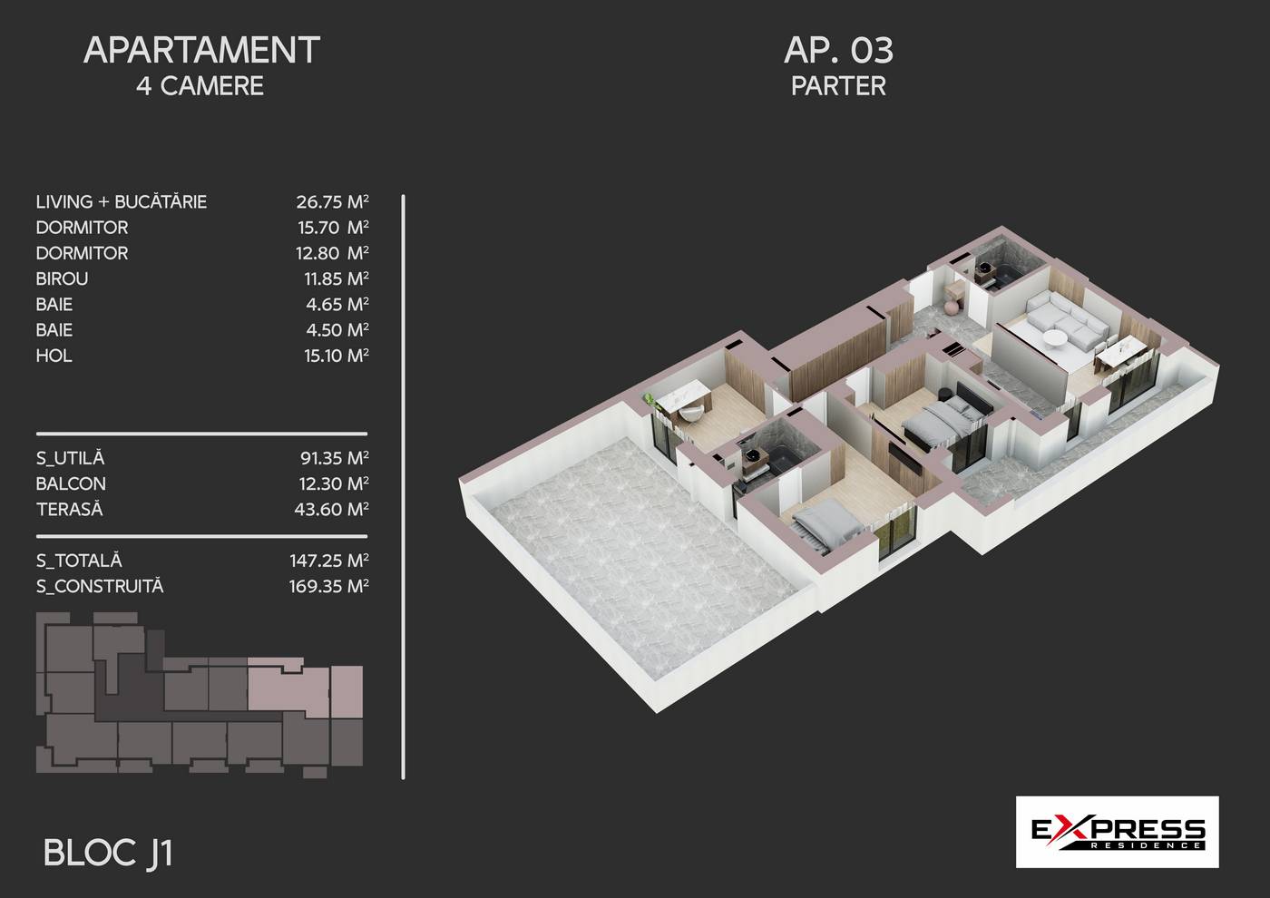 Locuinta beneficiaza de o suprafata utila de 91.35 mp, completata de un balcon de 12.30 mp si o terasa impresionanta de 43.60 mp, rezultand o suprafata totala de 147.25 mp – un spatiu rar, ideal pentru familii sau pentru cei care isi doresc mai mult confort si flexibilitate.