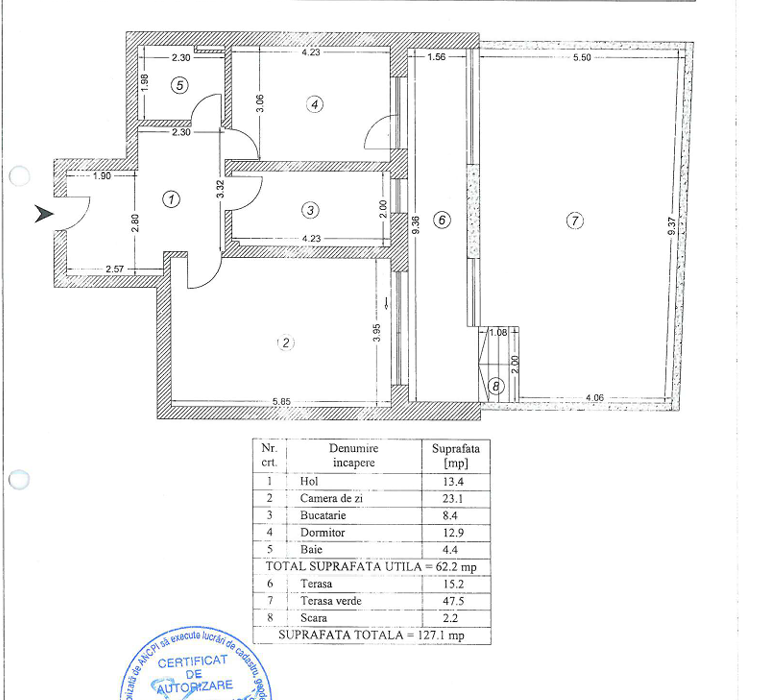 Locuinta are o suprafata utila de 62.2 mp, completata de o terasa de 15.2 mp si o terasa verde generoasa de 47.5 mp, rezultand o suprafata totala impresionanta de 127.1 mp.
