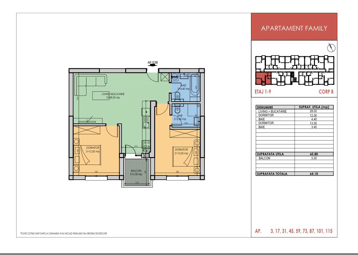 Locuinta este situata la etajul 6/9 si dispune de o suprafata utila totala de 64.10 mp, care include un balcon de 3.30 mp. Compartimentarea este echilibrata si eficienta, ideala pentru o familie sau pentru rezidenti care isi doresc spatii bine delimitate intre zona de zi si zona de noapte: