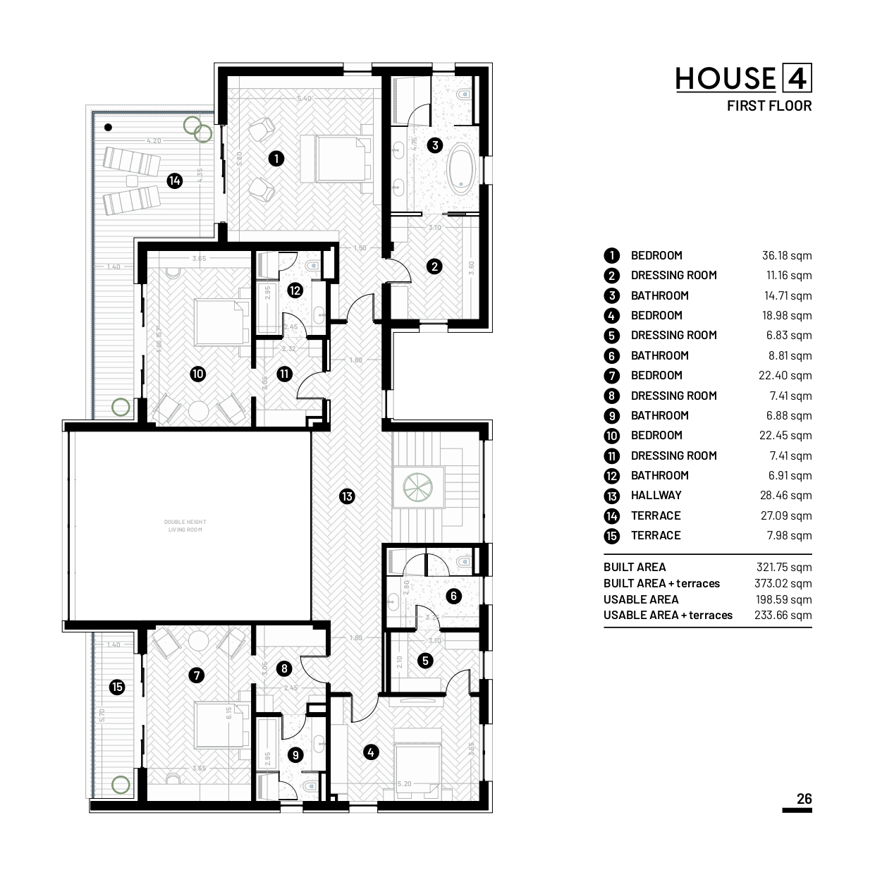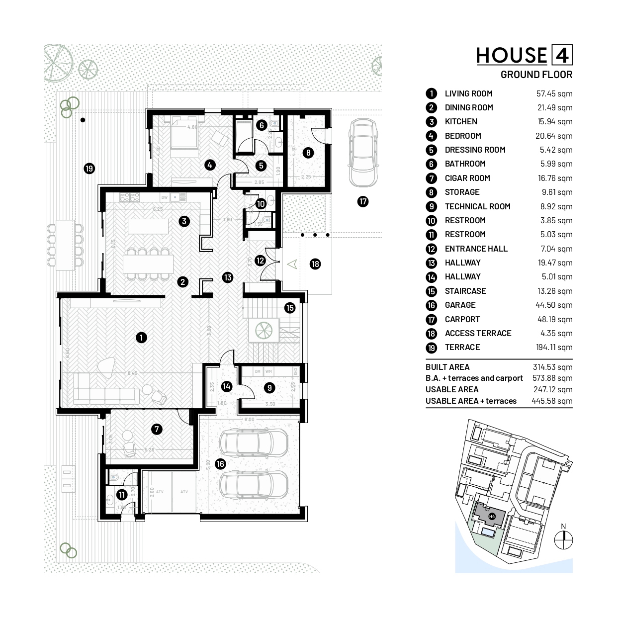 Parterul este gandit ca spatiu de interactiune si reprezentare, cu un living amplu ce comunica direct cu terasa si zona piscinei.
