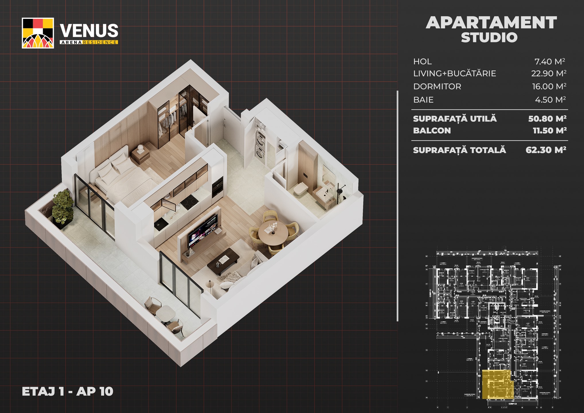 Locuinta este amplasata la etajul 1 din 6 si dispune de o suprafata utila de 50.80 mp, la care se adauga un balcon generos de 11.50 mp, rezultand o suprafata totala de 62.30 mp.