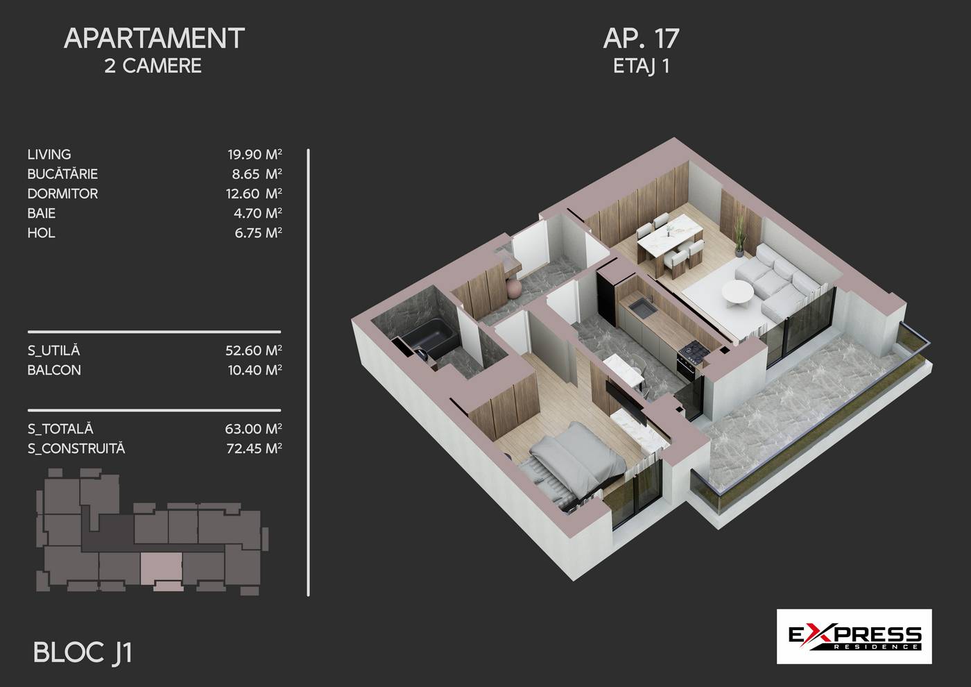 Locuinta dispune de o suprafata utila de 52.60 mp, completata de un balcon generos de 10.40 mp, rezultand o suprafata totala de 63.00 mp, ideala pentru un stil de viata confortabil sau pentru investitie.