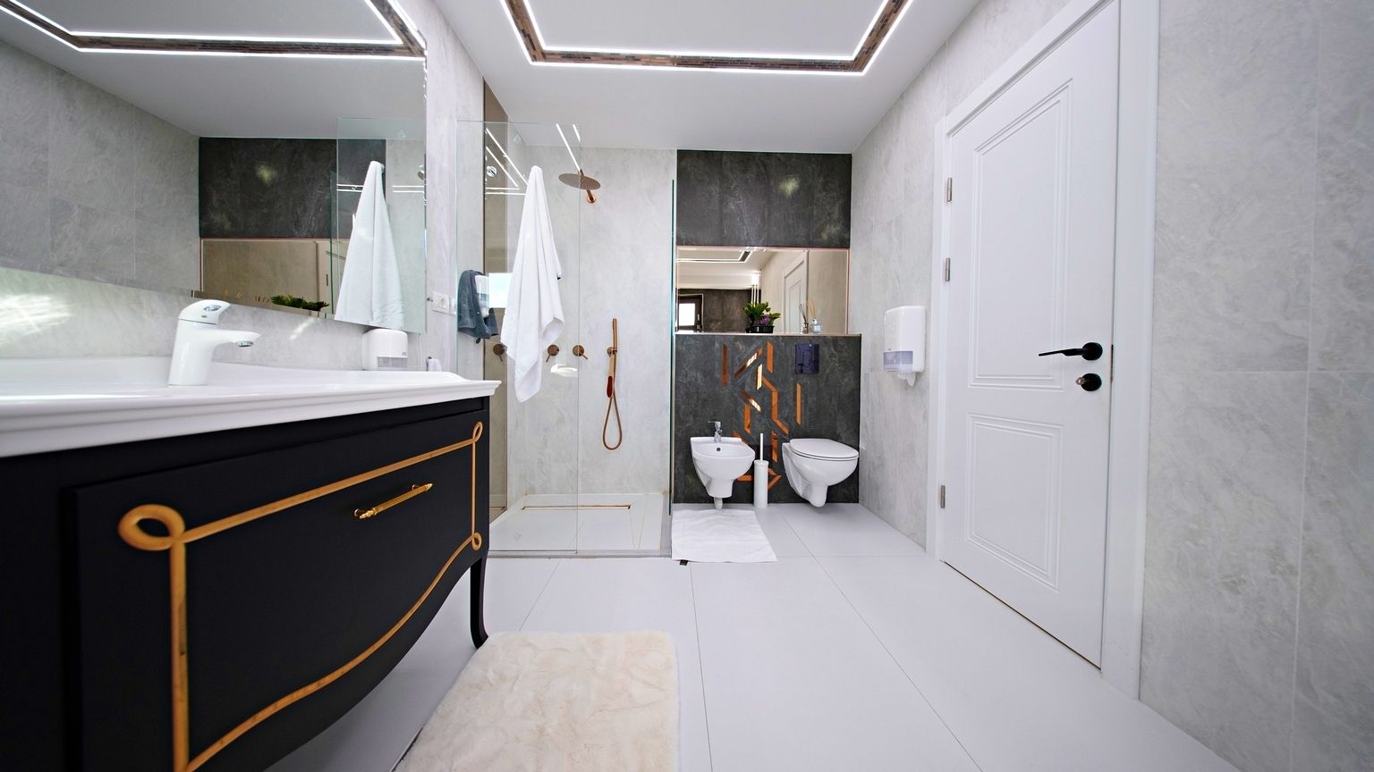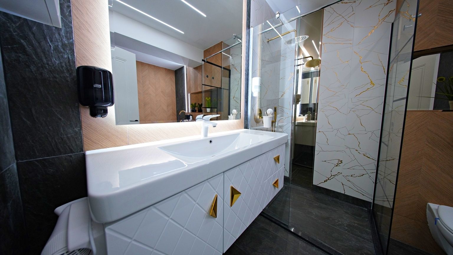 Finisajele sunt realizate din materiale naturale – piatra, lemn stratificat si sticla securizata – iar fiecare detaliu a fost gandit pentru a imbina estetica, functionalitatea si confortul.