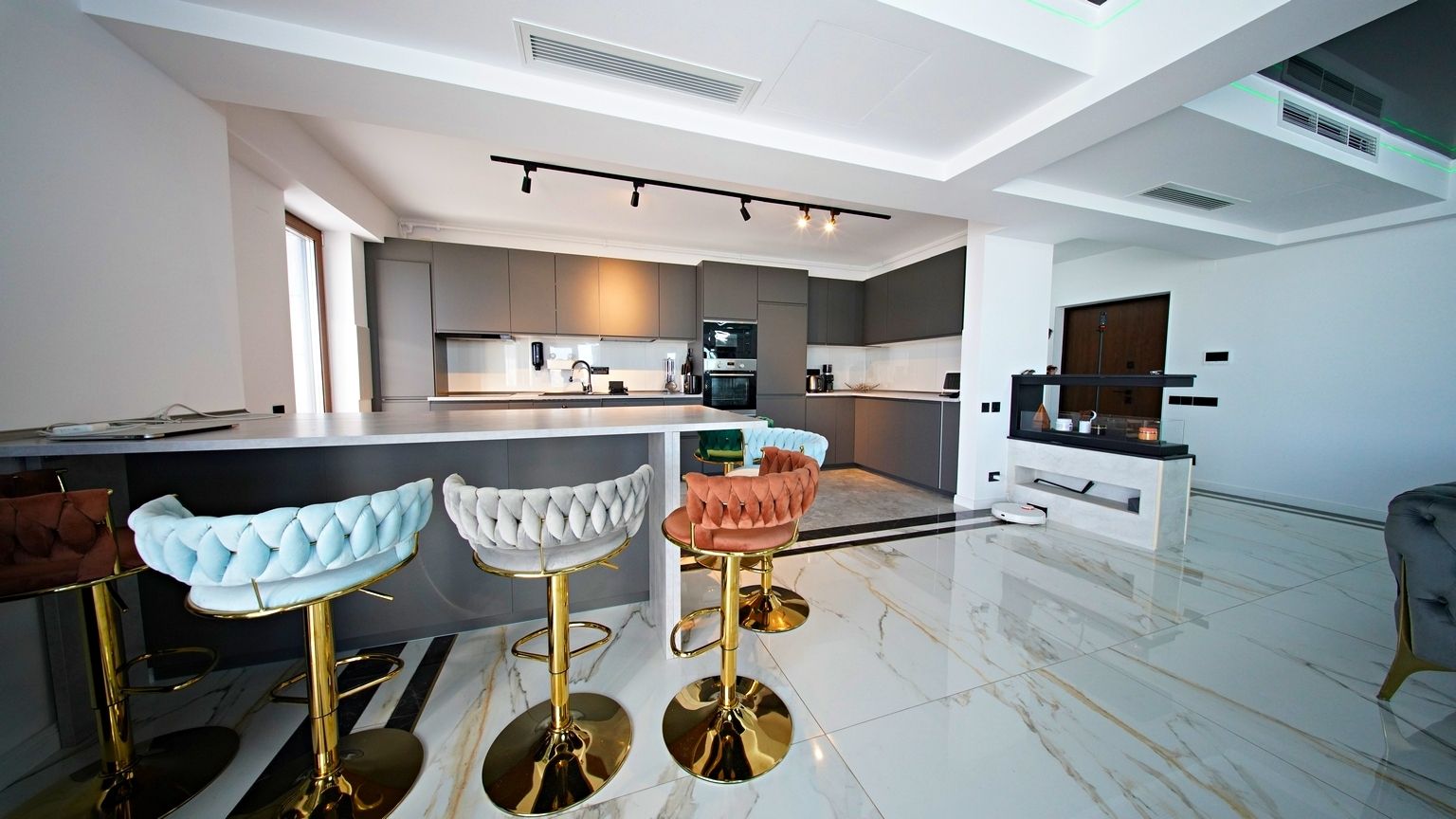 Proprietatea beneficiaza de sistem de climatizare centralizat cu control individual pe zone, asigurand confort termic optim in orice sezon.