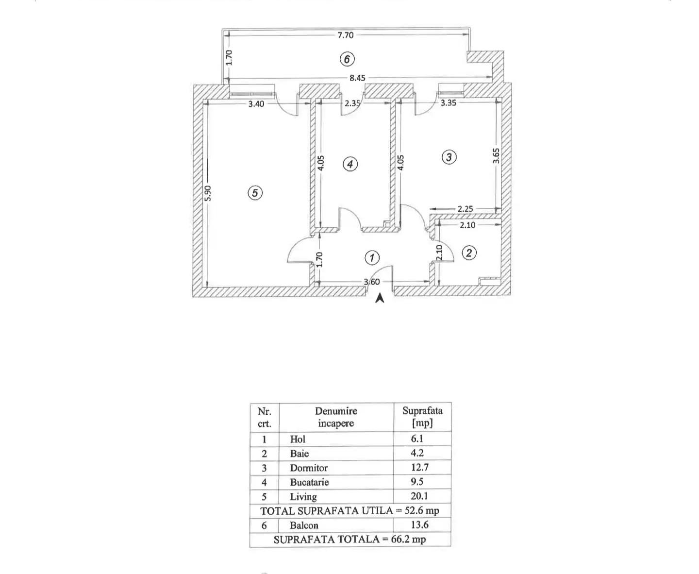 Living generos – 20.10 mp, cu zona de dining si acces catre balcon, dormitor spatios – 12.70 mp, bucatarie inchisa – 9.50 mp, baie moderna – 4.20 mp, complet echipata, hol de 6.10 mp