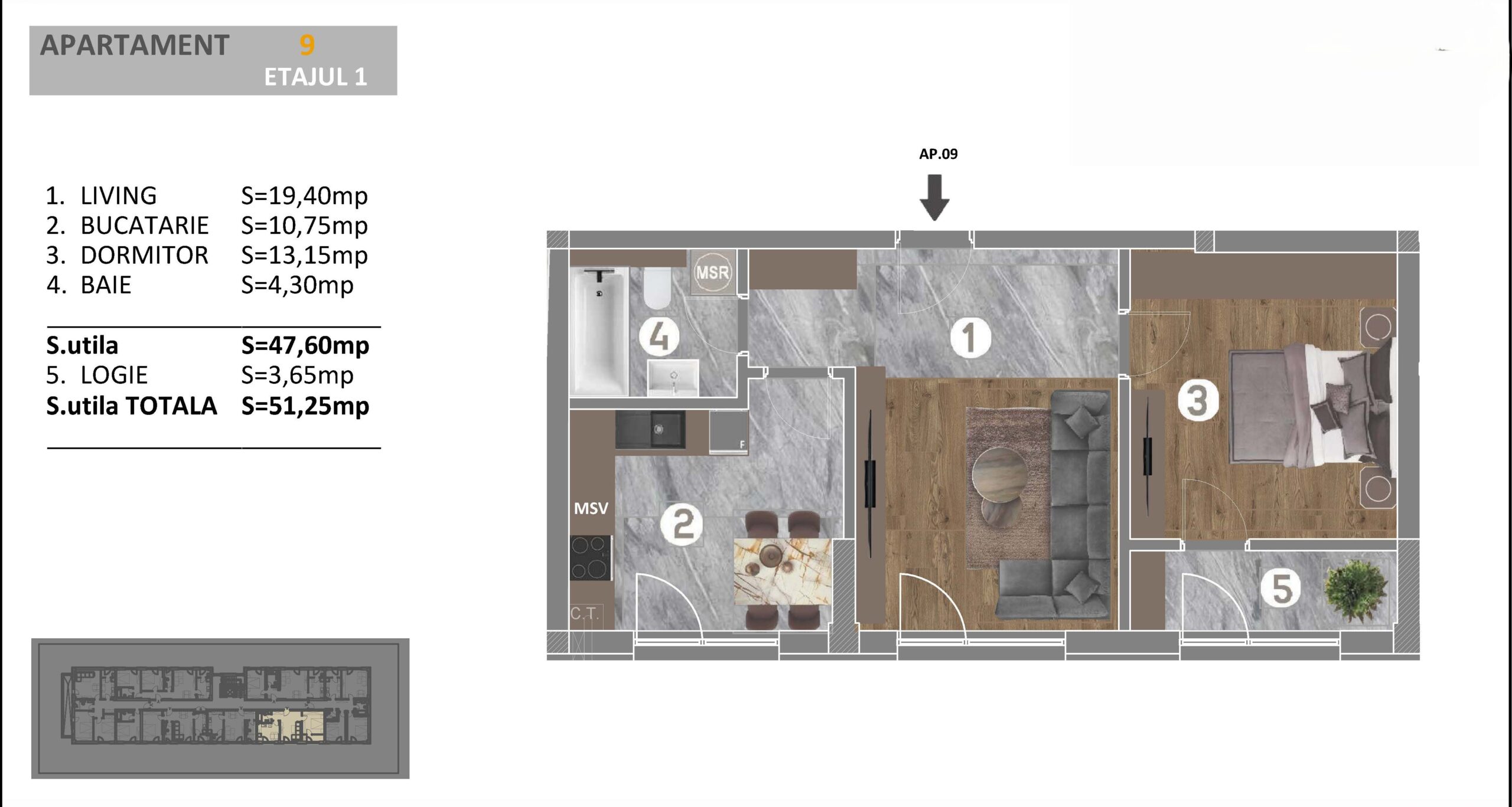 Apartamentul are o suprafata utila de 47.60 mp, la care se adauga o logie de 3.65 mp, ajungand la o suprafata totala de 51.25 mp.