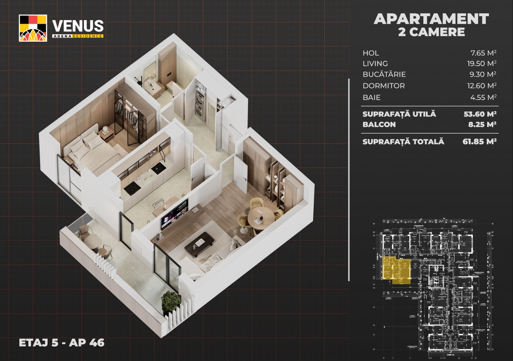 Venus Arena Residence is a reference residential project, composed of 5 buildings with a height regime – 2S+P+M+6E, each benefiting from underground parking on two levels, fast elevators, modern common areas, and access to an integrated commercial area.