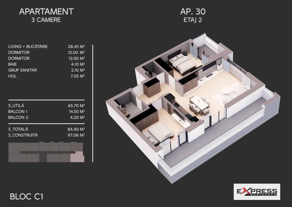 Suprafata utila: 65.70 mp, Balcon 1: 14.50 mp, Balcon 2: 4.20 mp,