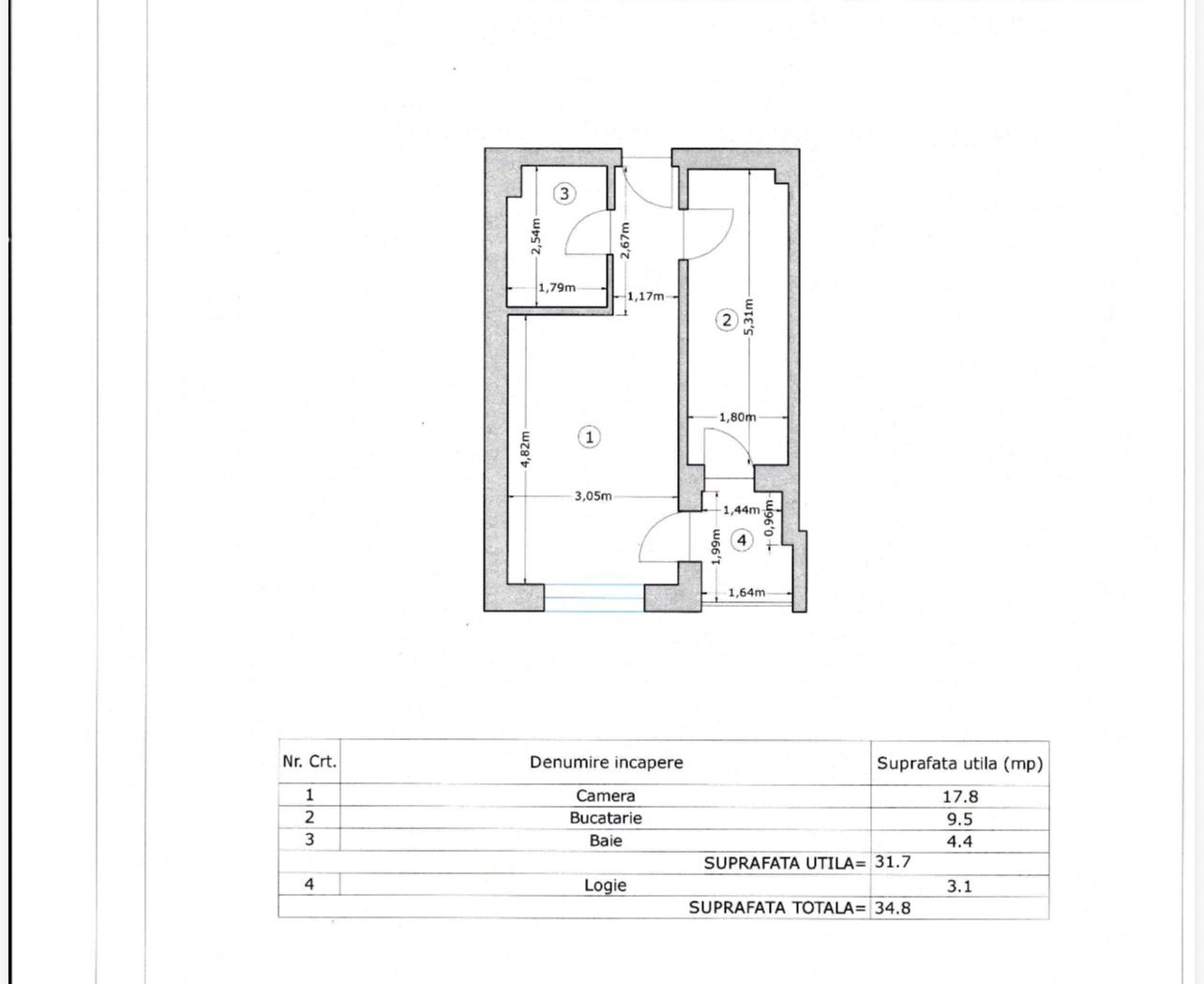 Locuinta dispune de o suprafata utila totala de 34.80 mp si se inchiriaza complet mobilata si utilata, fiind pregatita pentru mutare imediata, fara investitii suplimentare.