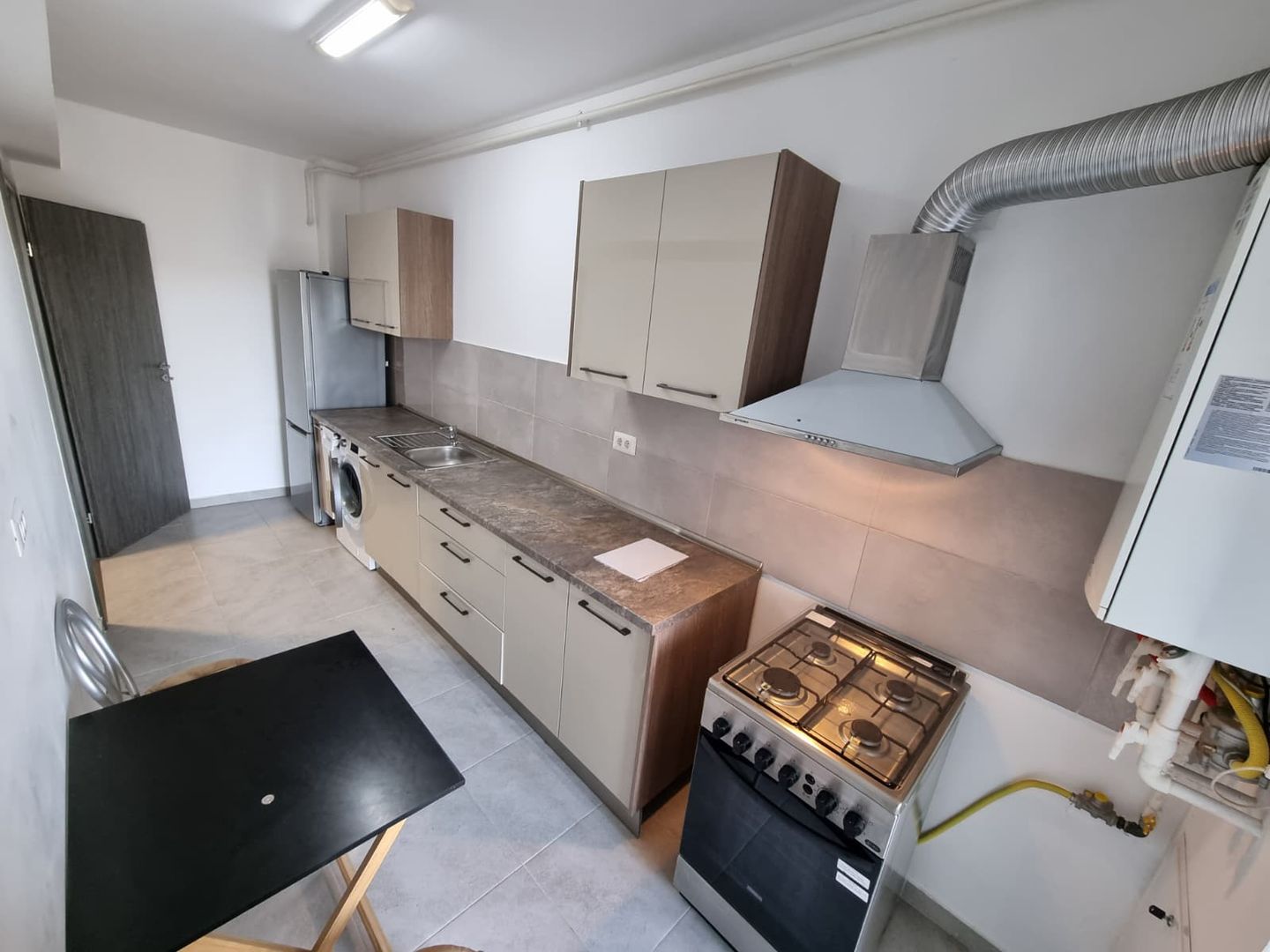 Compartimentarea este bine gandita, oferind un spatiu functional si confortabil. Bucataria este inchisa si complet echipata, iar zona de locuit beneficiaza de lumina naturala si o amenajare moderna, echilibrata.