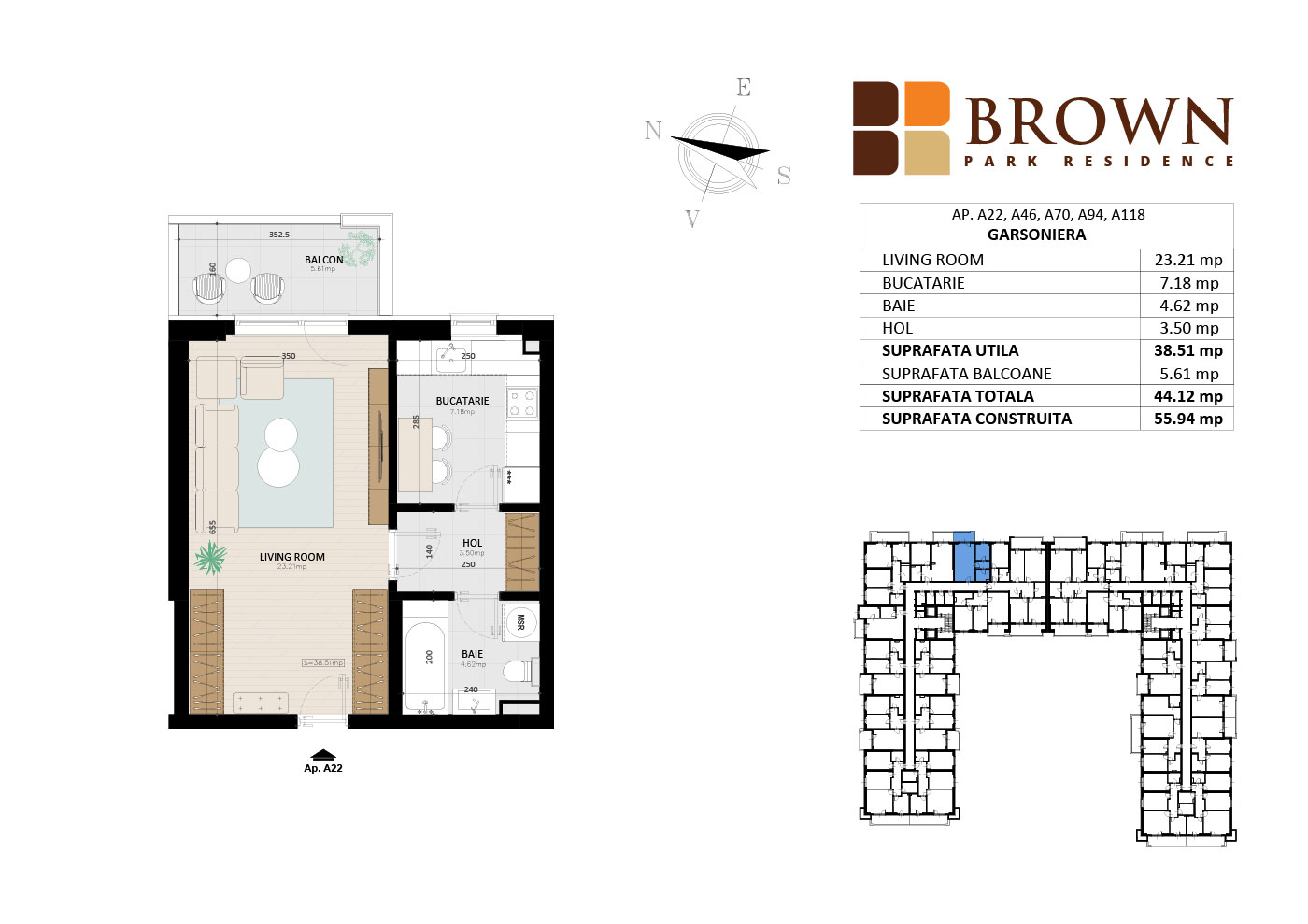 Apartament cu o camera – 44.12 mp, balcon de 5.61 mp | Brown Park Residence