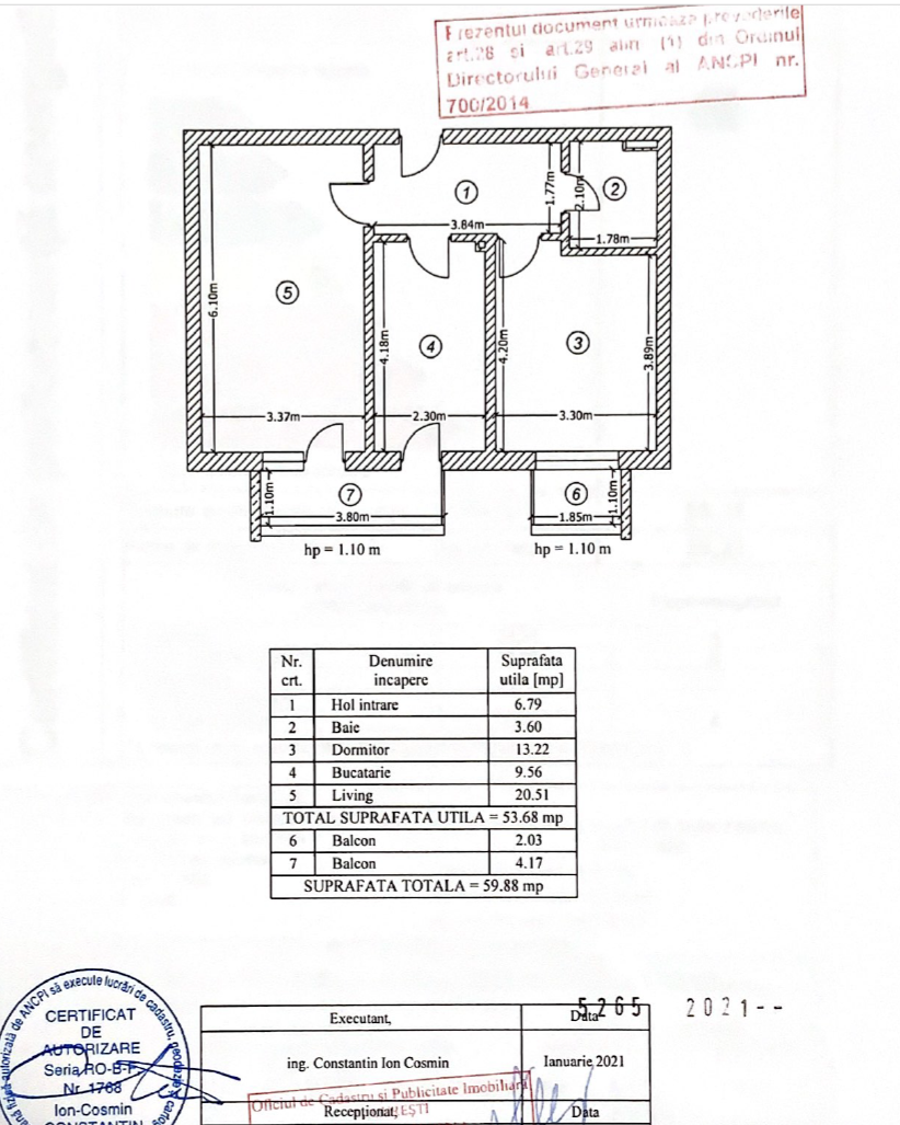 Locuinta are o suprafata utila de 53.68 mp, completata de doua balcoane cu o suprafata totala de 6.20 mp, rezultand o suprafata totala de 59.88 mp.