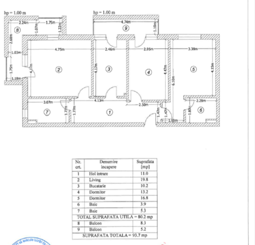 • living generos: 19.80 mp, dormitor matrimonial: 16.00 mp, cu baie proprie de 3.90 mp, dormitor secundar: 13.20 mp, bucatarie inchisa: 10.20 mp, baie: 5.30 mp, hol spatios: 11.00 mp, balcon: 8.30 mp, balcon: 5.20 mp