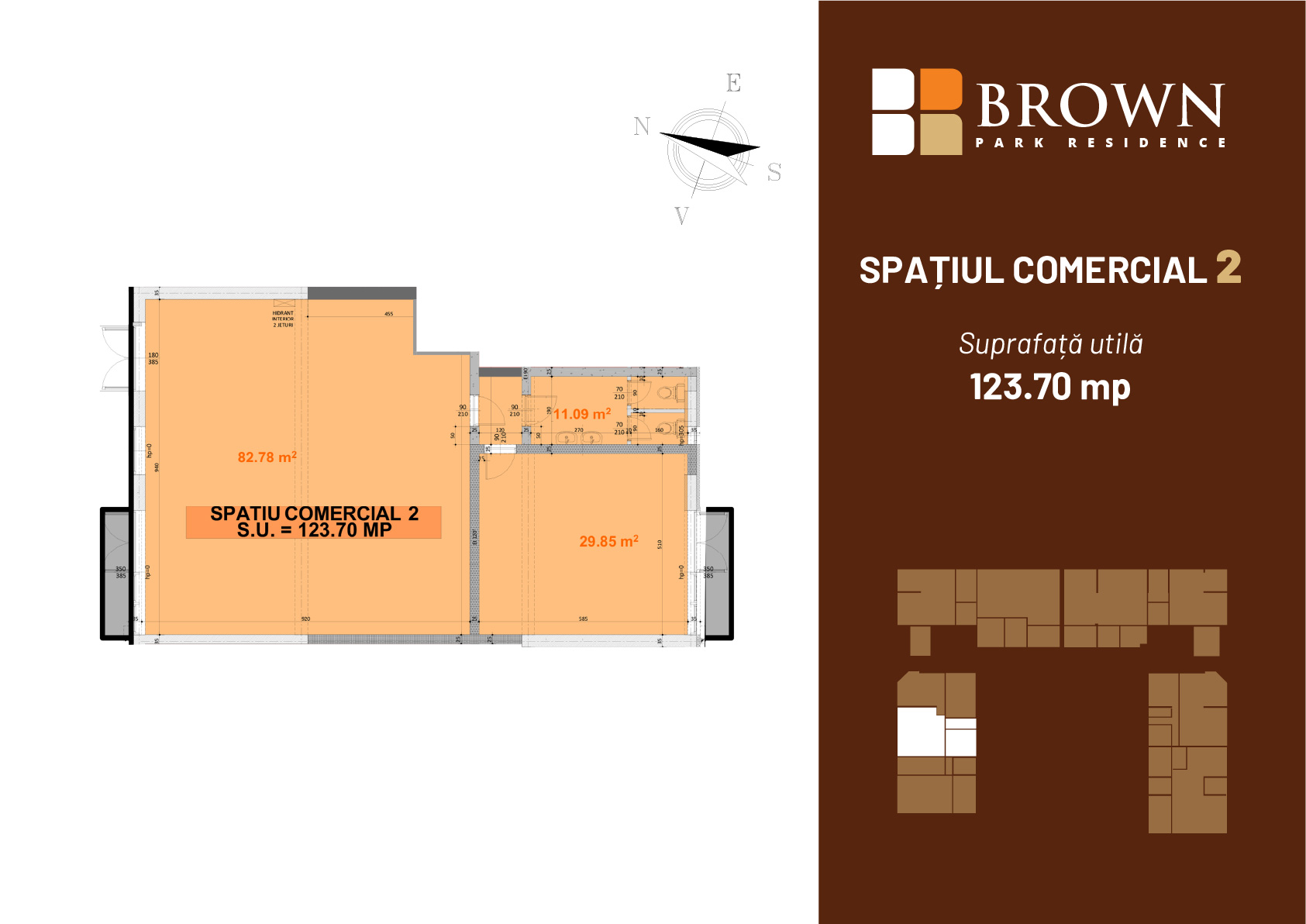 In cadrul proiectului imobiliar Brown Park Residence sunt disponibile spre inchiriere 4 spatii comerciale dispuse la parterul imobilelor, ce beneficiaza de suprafete intre 123.70 mp si 230.40 mp.