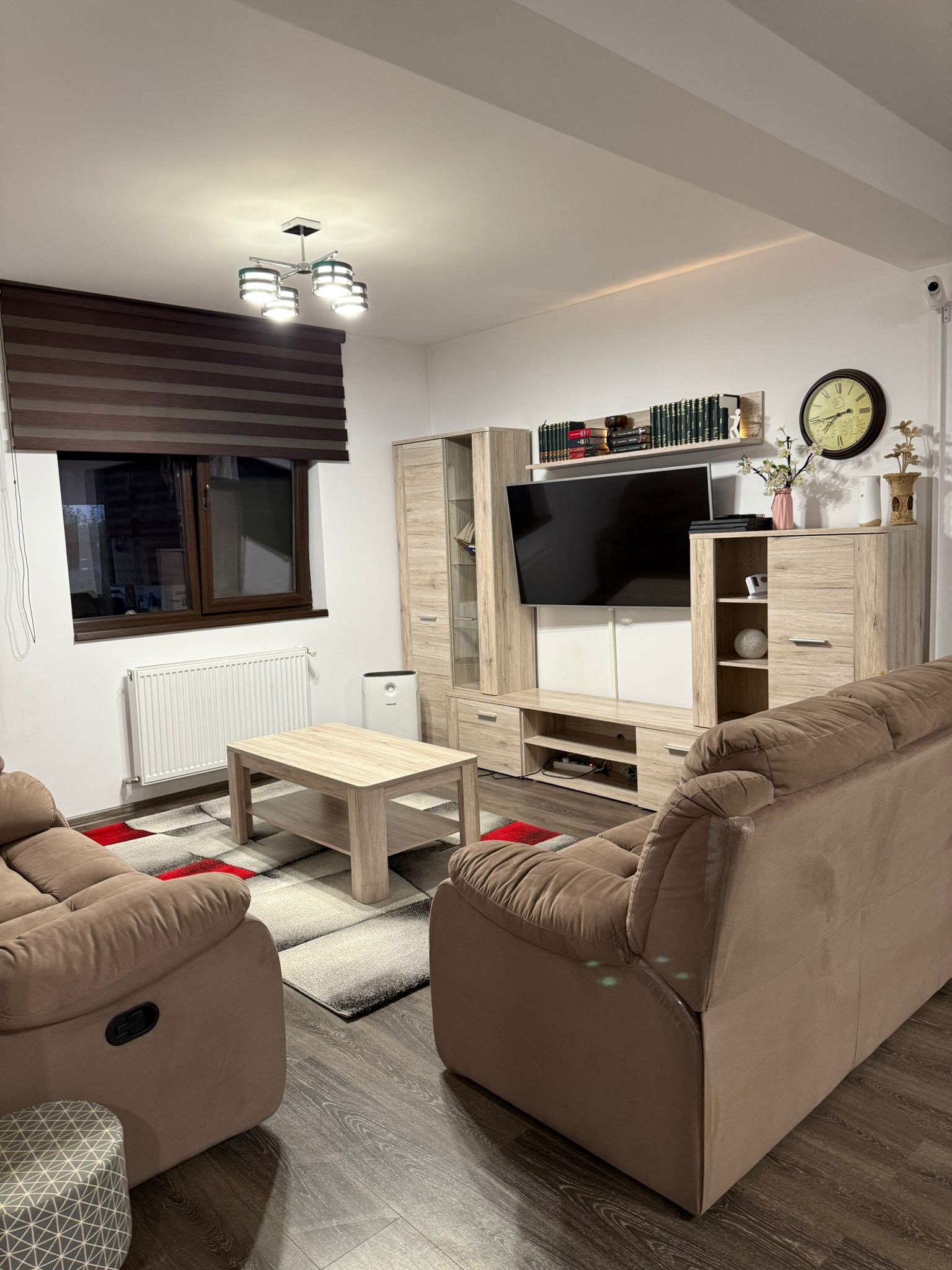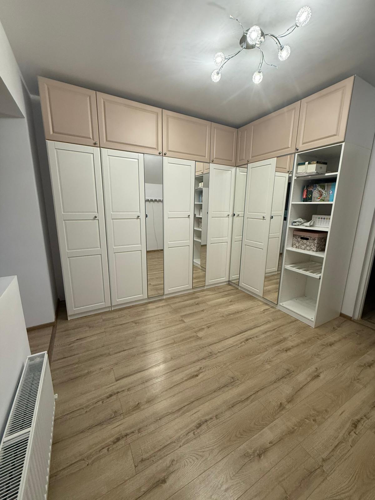 Living mobilat si climatizat, bucatarie complet echipata, dormitor secundar cu dressing si birou.