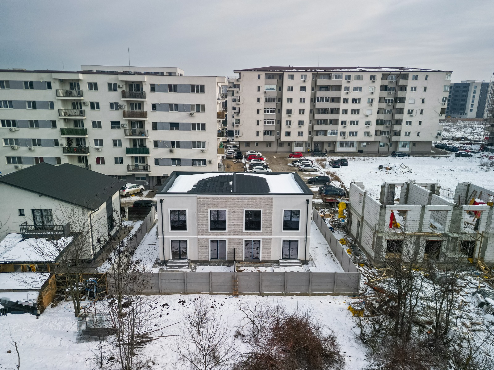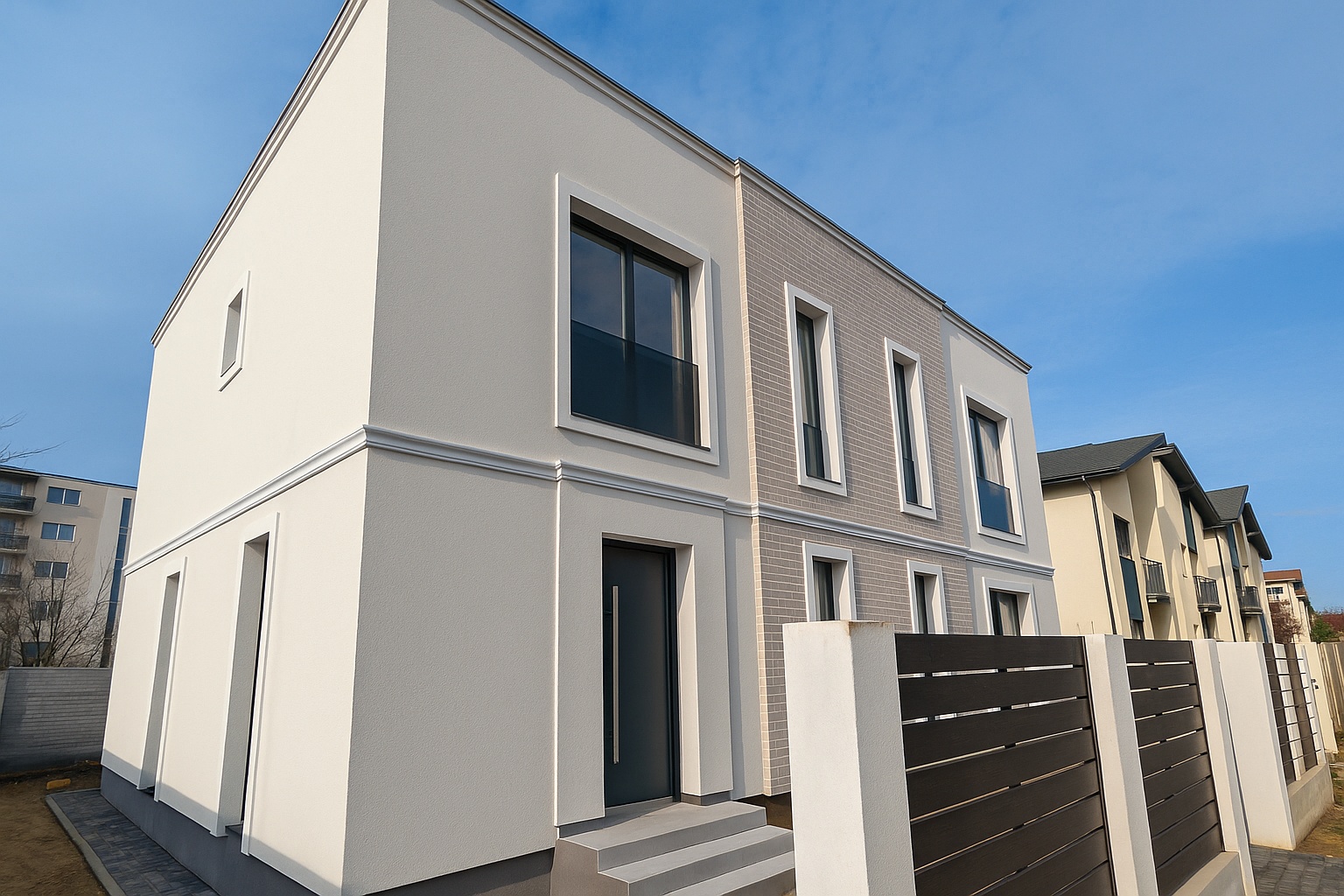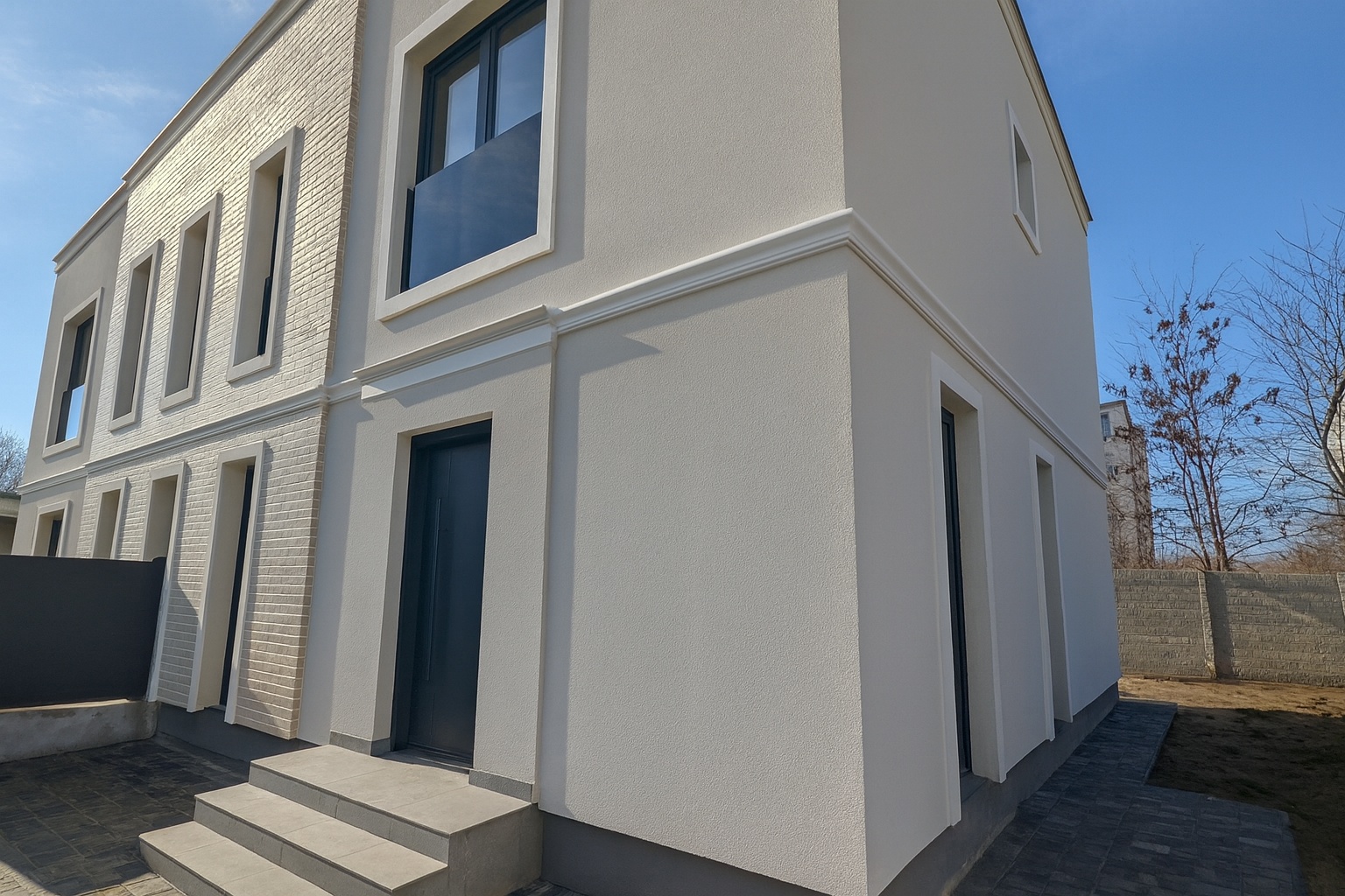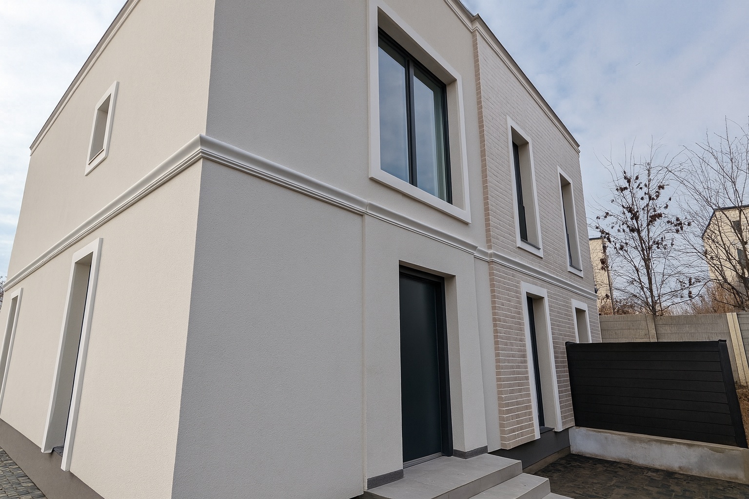 Descopera o vila tip duplex cu un design contemporan, cu regim de inaltime Parter + 1 Etaj si o arhitectura moderna, accente elegante si fatada in nuante neutre, care completeaza perfect peisajul urban linistit din zona.