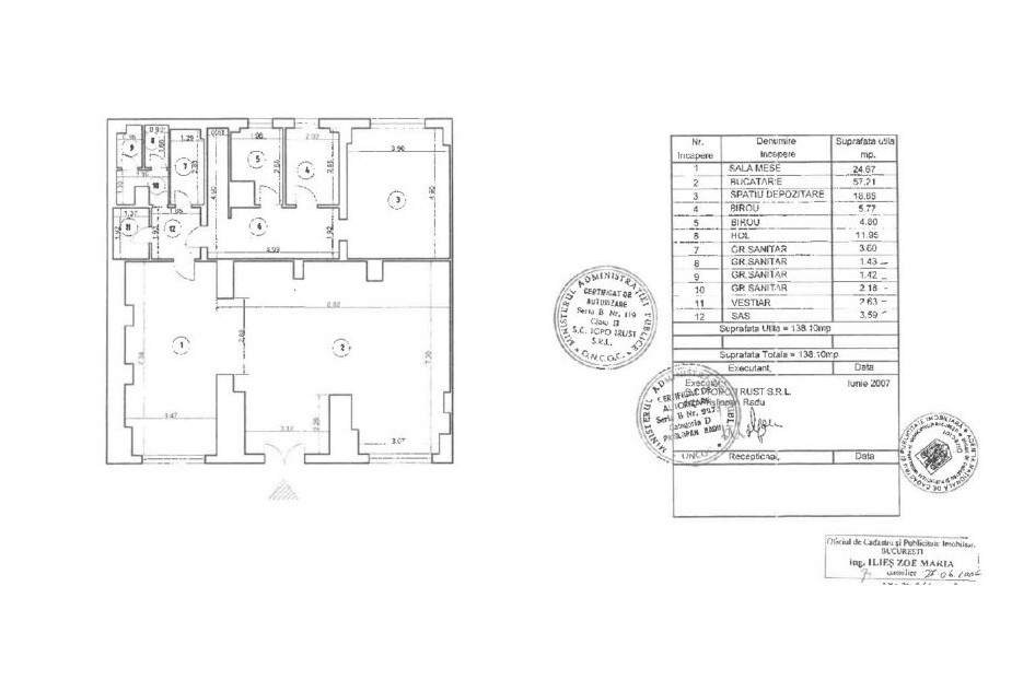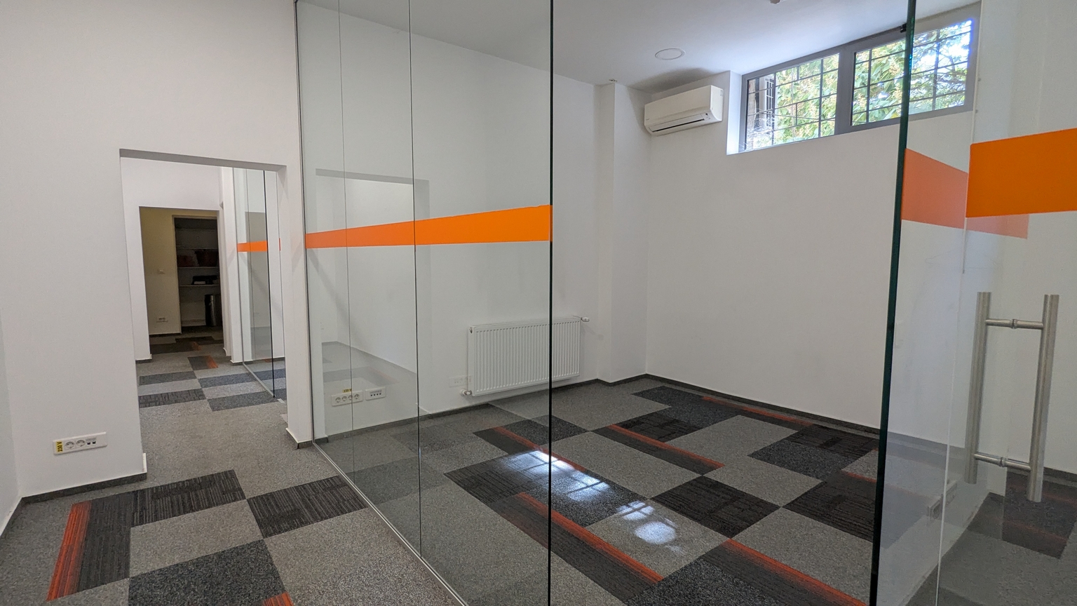compartimentare flexibila, realizata cu pereti din sticla, ce include birouri, spatii de depozitare, grupuri sanitare si bucatarie mobilata